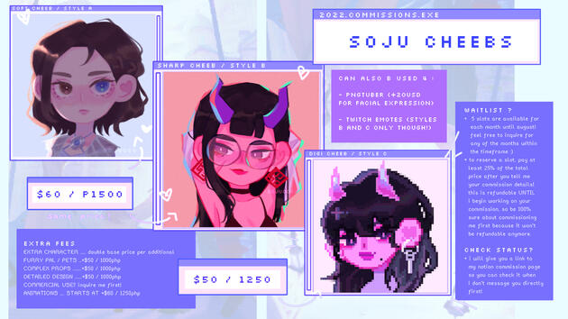 ☆ the reservation fee for the next batch costs $5 / 200 php ! this only applies when my commission status says that it's open for reservation.☆ this is non refundable. to avoid causing mishaps, please be very sure that you want to commission me before reserving a slot.☆ if your commission costs more than $100, you can pay 25% of the overall fee in place of the reservation fee after we discuss the total exact pricing. unlike simpler pieces under $100, this is refundable!