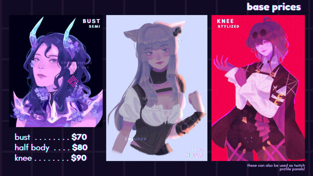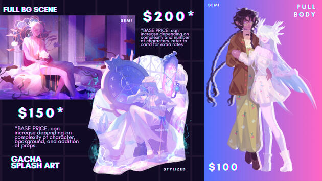 ☆ i will not start on a commission until u have paid in full and upfront. payment methods are only through PAYPAL and **GCASH (for ph clients only).☆ since these are stylized painting commissions, i will be interpreting your commission in my art style. you may ask me to make it more cartoony/stylized or a little more semi-realistic if you wish.☆ i still have personal rights to the artworks. (ex. portfolio) however, you can tell me if u don't want me to post them on social media.☆ you are free to use ur commission for personal purposes + post them online with proper credit.☆ if you wish to use m commission for COMMERCIAL PURPOSES , please tell me so we can discuss pricing.☆ I WILL NOT DRAW NSFW PIECES FOR MINORS. please be of age if ure going to request a nsfw / have ur age in ur bio . if i get suspicious i will ask you for a valid id with ur birthdate (but please block out everything else for ur privacy!)☆ it will take me a A DAY UP UNTIL 2 MONTHS at most to finish your commission , but this depends on the amount of workload i have + how heavy ur commission is , as well as other conditions in personal life. rest assured however since 'll immediately communicate with you if anything may happen!☆ i have the right to refuse to do a commission if i do not think 'm up for it / violates my terms.☆ DO NOT SELL MY WORKS AS NFTs. yes you have personal and possibly commercial rights to my works if you pay for the fee, however please do not sell my commission as an NFT.☆ understand that i can only give you digital copies of your commissions. i cannot ship or give you a physical copy. commissions are also signed and watermarked unless you wish to use it for commercial purposes which i can only allow after the fee has been settled. otherwise, DO NOT REMOVE MY WATERMARKS/SIGNATURES.☆ my commissions are NON REFUNDABLE even if i haven't started on the sketch unless you saved a spot for the waitlist, so please be very sure about commissioning me before sending a form and paying. reservation slots are refundable if you ask for the request before the month you reserved for. otherwise, you can't refund anymore.☆ FOR NSFW COMMISSIONS, **regarding references, if you are going to use images of yourself please warn me beforehand or at least censor ur parts. another thing to take note of is that just because i'm working on nsfw doesn't mean i am consenting to do anything beyond working on your commission. i am only here to draw for you, nothing more. please keep conversations professional. the moment i think my boundaries are being crossed, i will immediately cancel your commission.